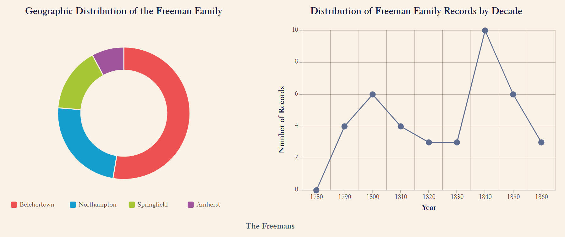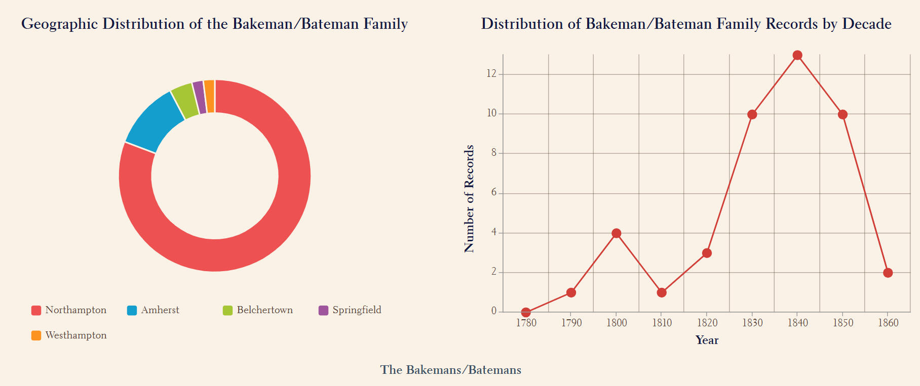 2) Certain prominent families were notably concentrated in specific neighborhoods, reflecting strong historical ties to those areas. For example, the Bakemans were prominent in Northampton, the Freemans in Belchertown, and the Jacksons in both Amherst and Northampton.