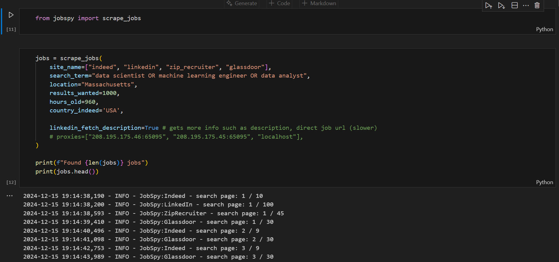 1) Scraping job posting data from Google, Indeed, LinkedIn, ZipRecruiter and Glassdoor using the JobSpy library.