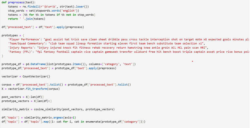 I applied NLP techniques to analyze just under 1000 Reddit posts related to Gameweek 30 and Gameweek 34 of the Premier League season and defined during-game & non-game periodsThe NLP analysis was done through the following steps: