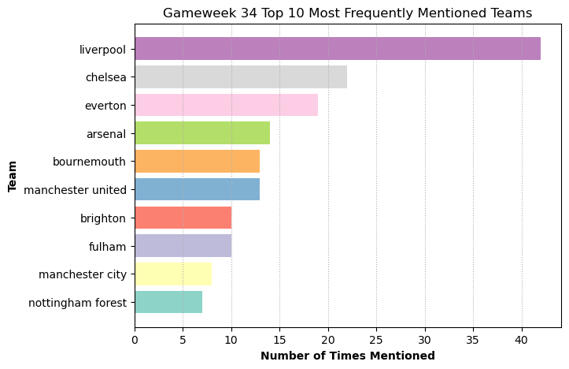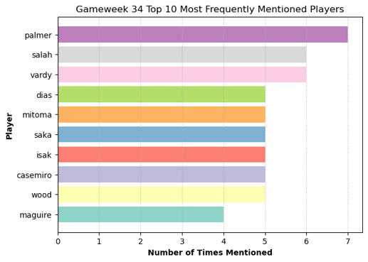 1) The results (as shown in the bar charts below) reflected fan hype surrounding the title winners, as in Gameweek 34 Liverpool clinched the Premier League title with their 5-1 thumping of Tottenham. Cole Palmer was the most frequently discussed player, likely somewhat due to his extremely poor run of form given his calibre.