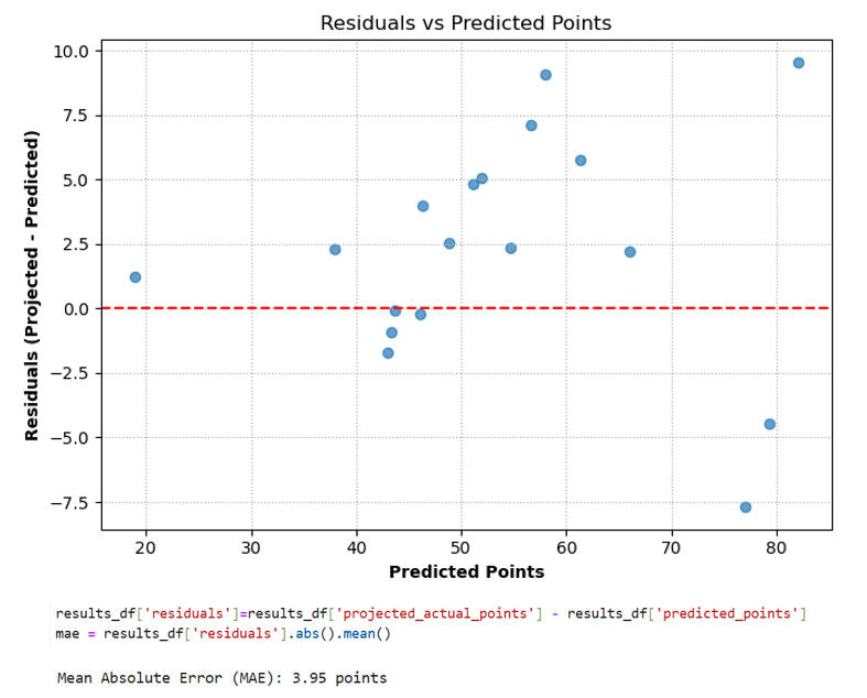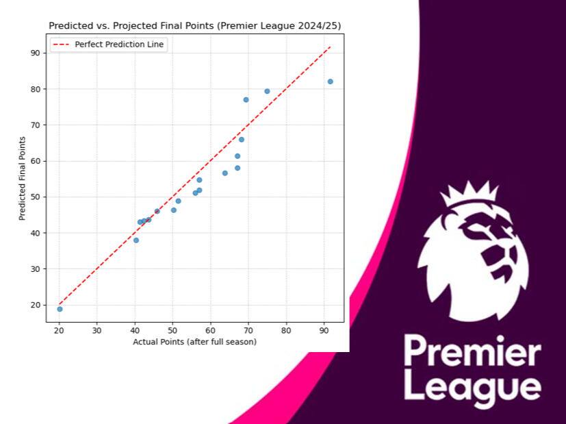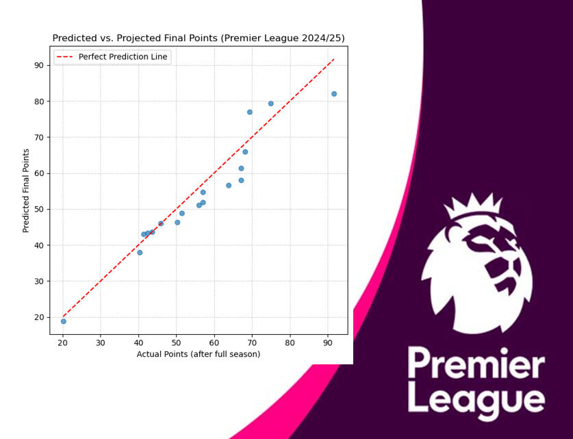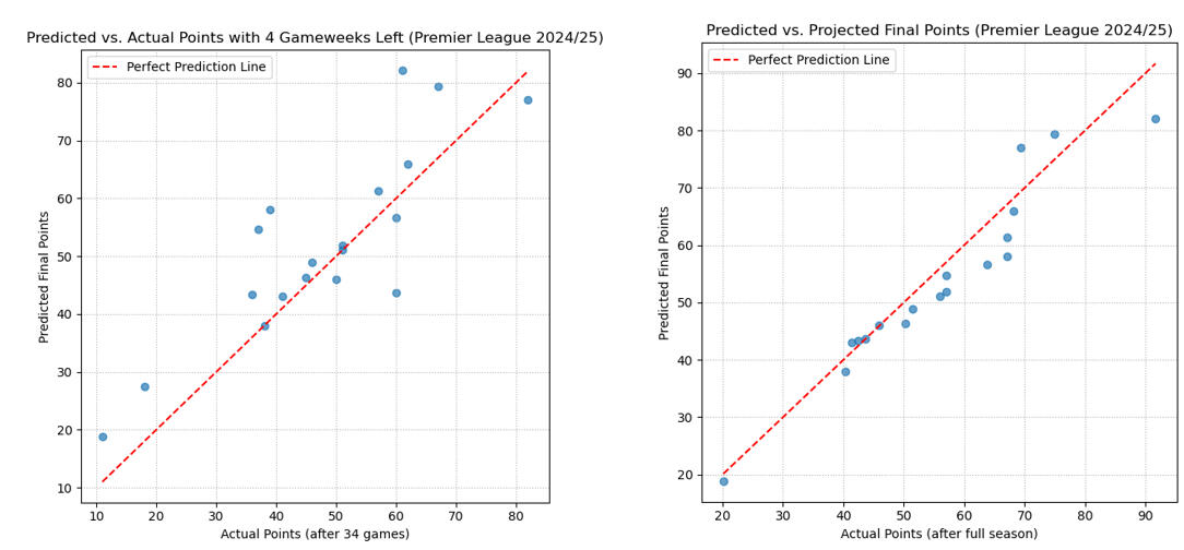 1) The year combination that yielded the most accurate prediction—based on the lowest Mean Absolute Error (MAE)—was the 2022/23 to 2024/25 seasons, with an MAE of just 3.95 points. Using this optimal model, scatter and regression plots were made to visualize the relationship between actual and predicted points & projected final points and predicted points.