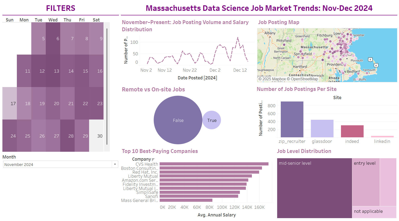 In December 2024, my colleagues Branson, Alexia, and I investigated trends in Massachusetts' data science job market, focusing on postings, salaries, and remote work.Here are the questions that we were interested in answering:
