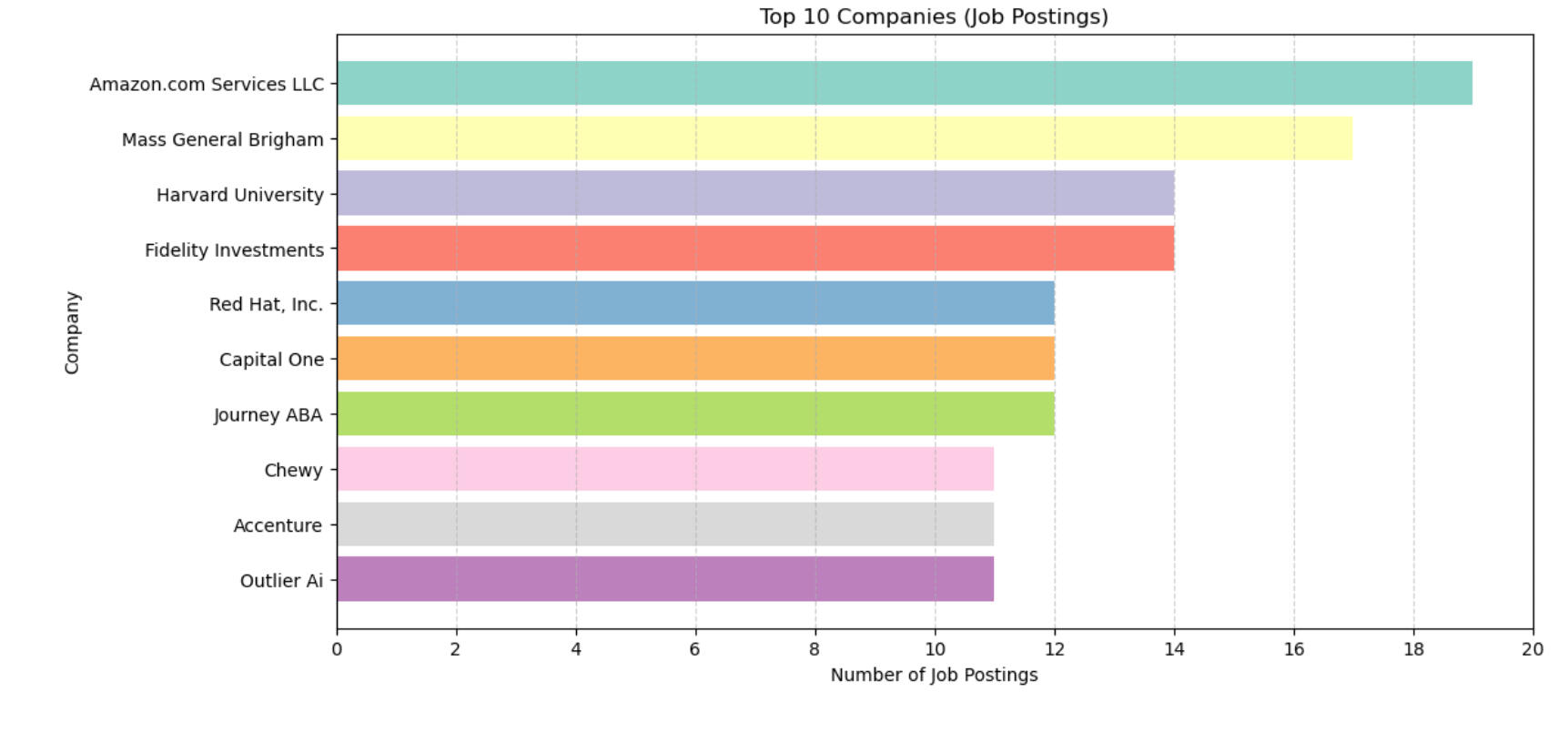 5) Amazon led all companies in listed job postings, followed closely by Mass General Brigham, Harvard University, and Fidelity Investments.