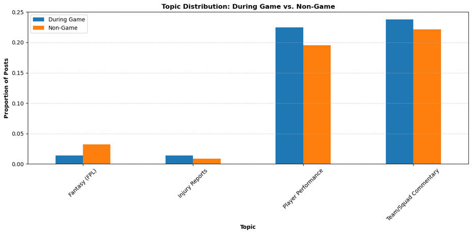 2) All discussion categories (Player Performance, Team/Squad Commentary, and Injury Reports) showed noticeably higher post volume during game periods. The sole exception was Fantasy Premier League related posts, which saw a higher post volume during non-game periods (FPL manager seem to discuss strategy and other topics more often prior and after games, rather than during).