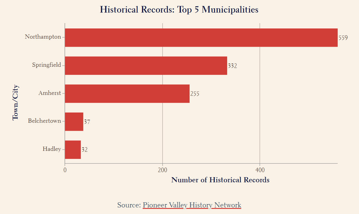 1) Northampton (559) had the highest number of archival records, followed by Springfield (332) and Amherst (255).